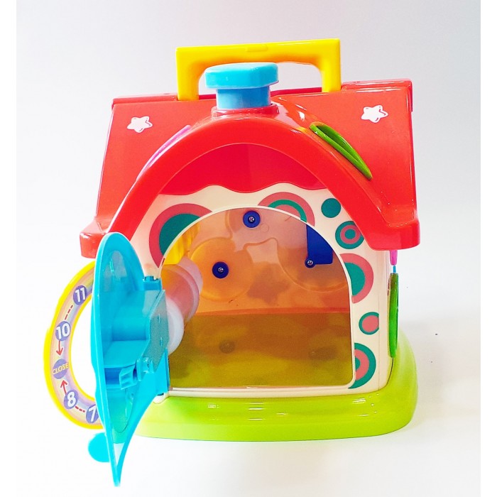 Всі стіни та дах будиночка мають міні-ігри. Отвори для літер (латинського алфавіту) і фігурок, 3 шестерні з рукояткою, що обертаються, сторона з годинником і фруктами, завдяки якій малюк зможе їх вивчити, сторона з рахунками, що обертається кулькою-брязкальцем і барабаном з веселими картинками.